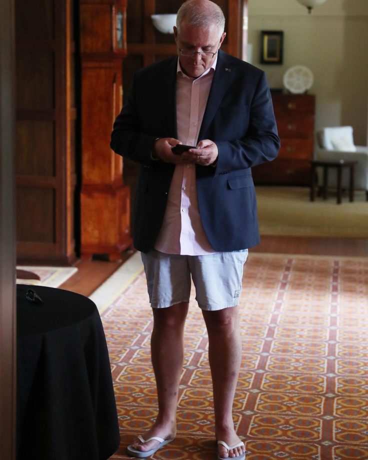 And in case you missed the reference to ‘flip-flops & dinner jackets’ here’s Australia’s Prime Minister Scott Morrison, currently in COVID-iso but still on the job…(pants optional).
